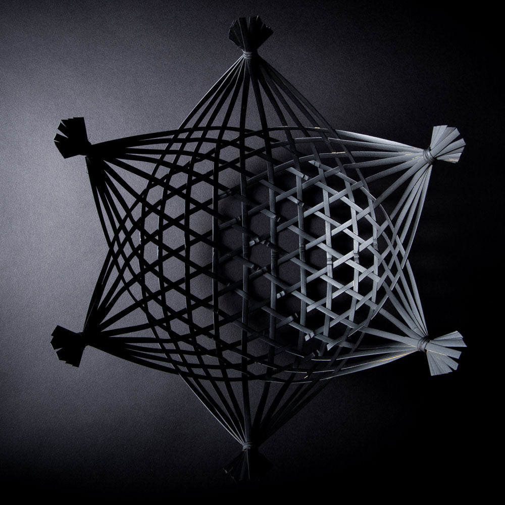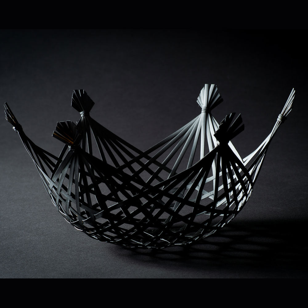 六ツ目編を六方に束ねた吹上篭に竹炭を塗布しました。ダイナミックな造形美が楽しめる演出食器です。