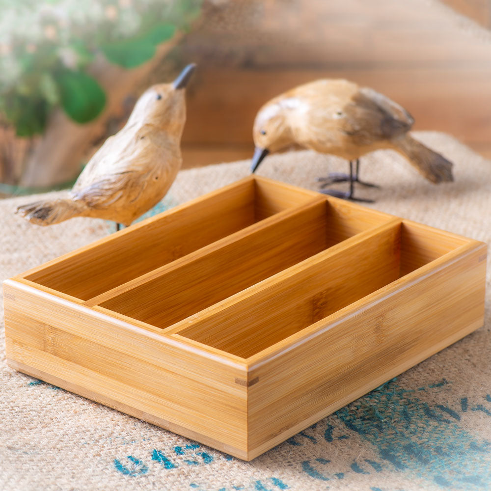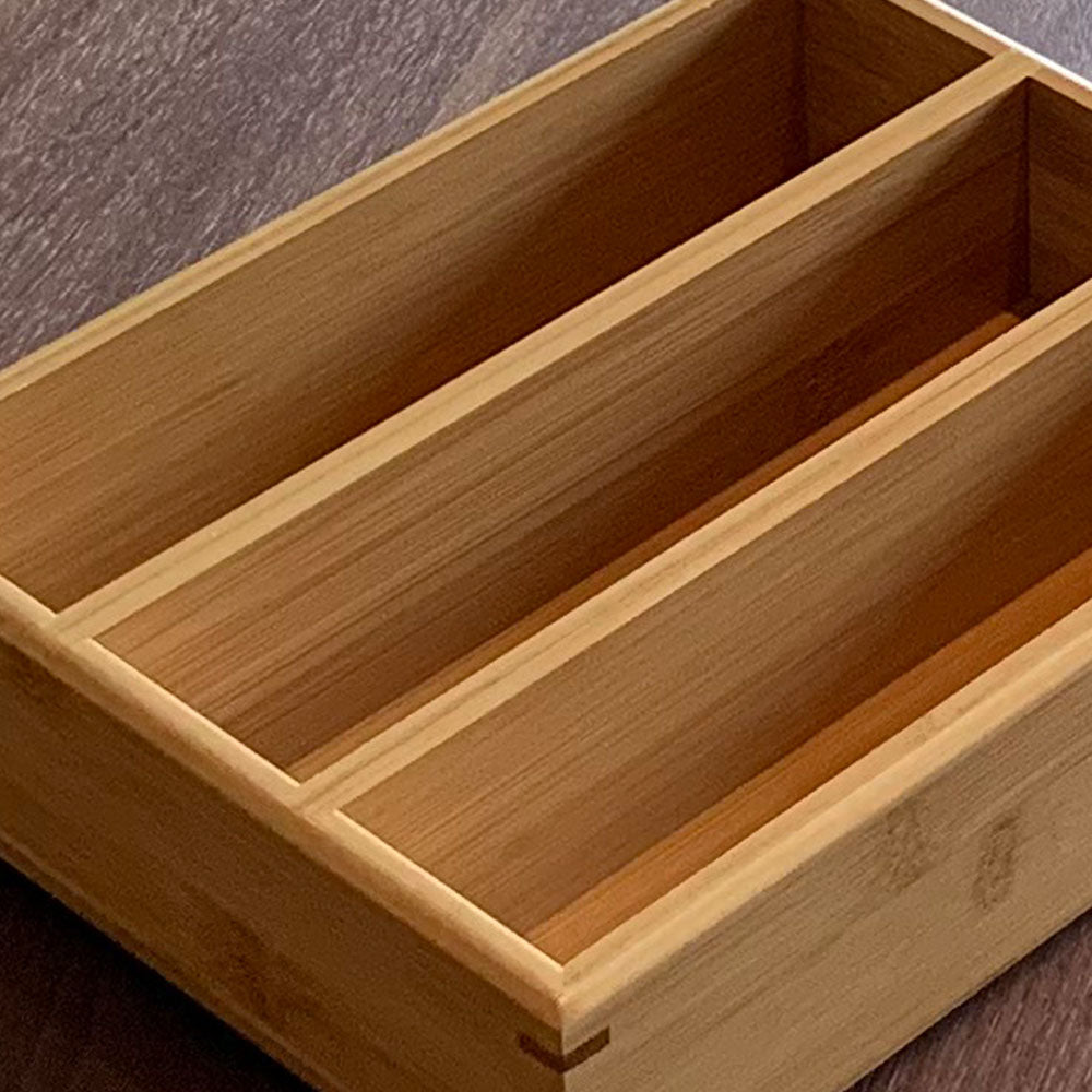 繊維が平行になるように圧着された竹の集成材で作られた小物入れ。仕切があるので、カード類や名刺、細々した物の整理に最適です。