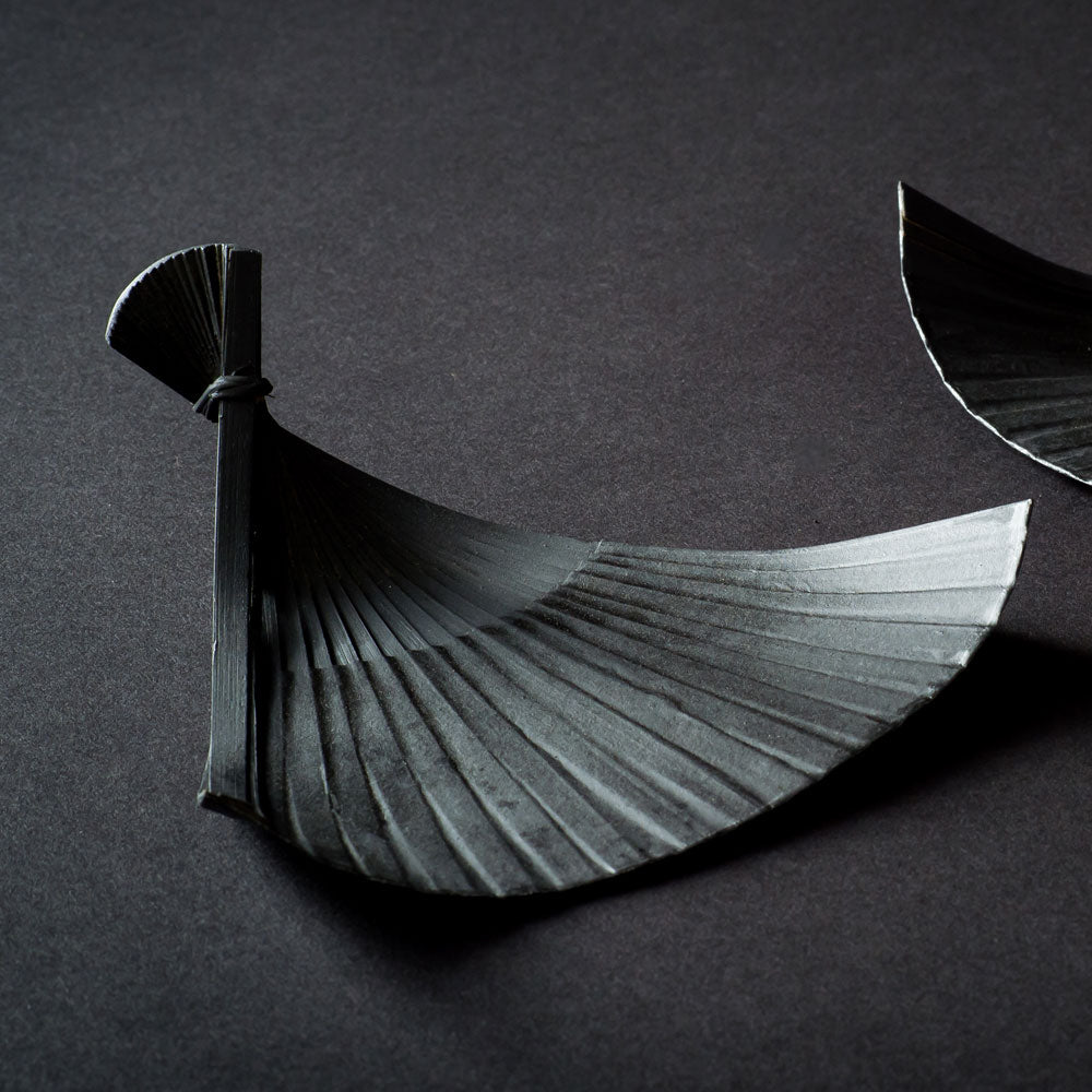 加工できる職人が少ない希少な和紙一閑張りの扇子皿に竹炭を塗布しました。色鮮やかな和菓子やスイーツが映えるアイテム。