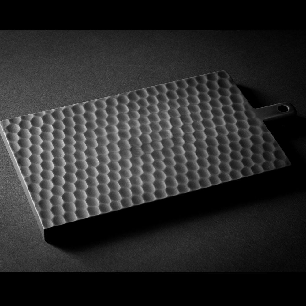 表面をノミで削ったゴムの木がベースのカッティングボードに竹炭塗を施しました。凹凸のコントラストが美しいアイテムでおもてなしのプレートとして大人気です。