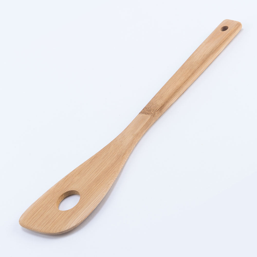 フライパンに直接触れるものなので、化学塗料は使用しておりません。竹製のターナーは軽くて丈夫。中央の穴で食材が張り付きにくいのも特徴です。