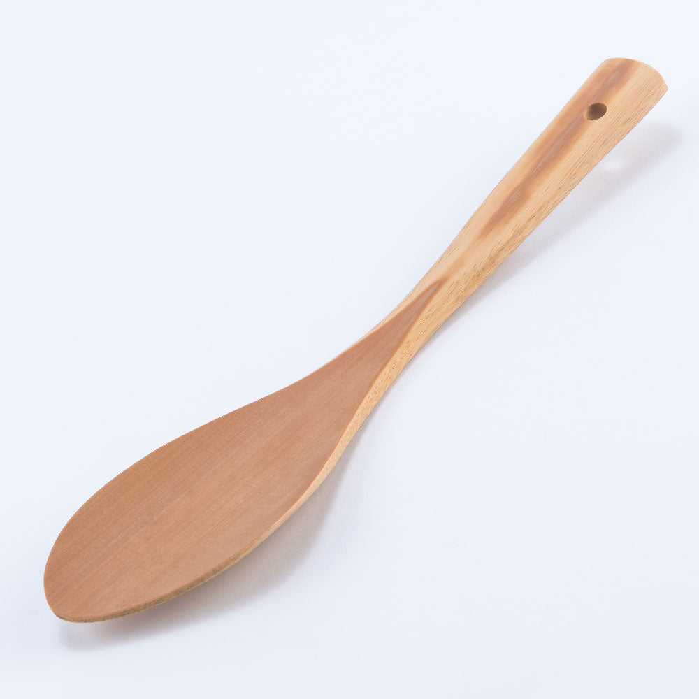 フライパンに直接触れるものなので、化学塗料は使用しておりません。竹製のターナーは軽くて丈夫。ゆるやかなカーブで食材を返しやすいのが特徴です。